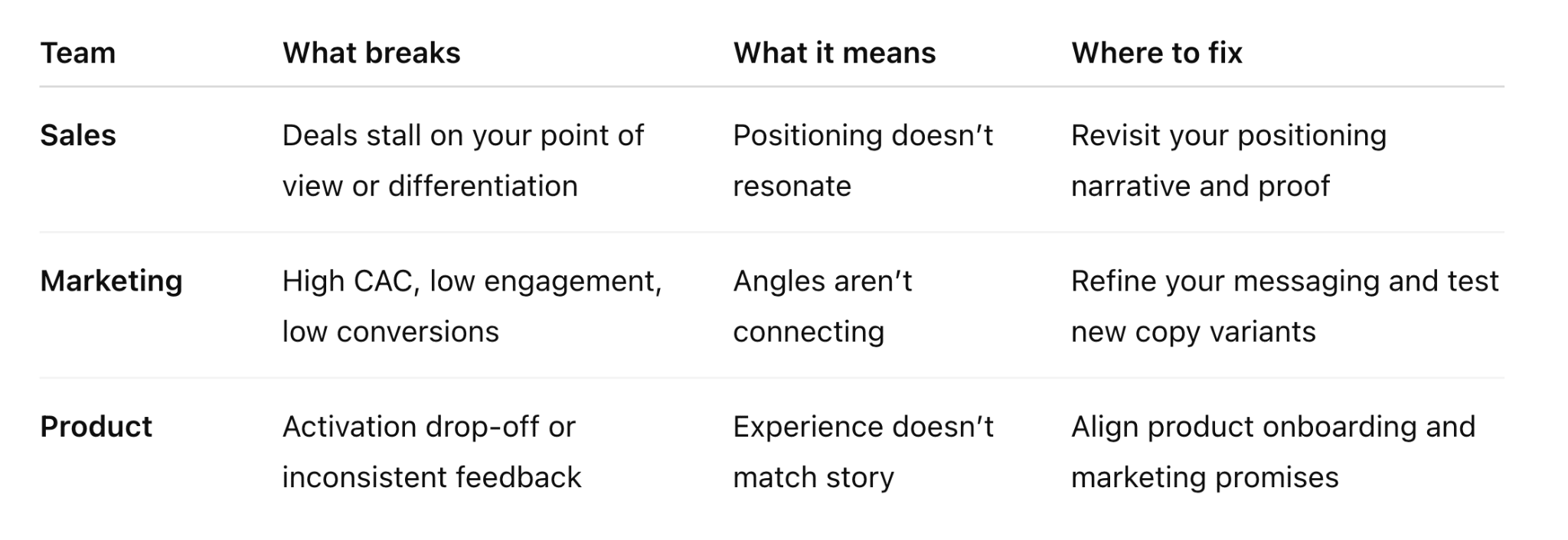 That’s when messaging starts becoming a flywheel. Step 3: Diagnose, don’t guessWhen your foundation is in place, you can finally diagnose problems instead of guessing at symptoms. Here’s how it looks across teams: Once the system is in place, you can really scale your messaging, because you have a clear way to monitor it at every touch point. Step 4: Keep everyone on the same roadAs companies grow, messaging gets harder to control. New hires join, priorities shift, new competitors pop up, teams launch faster than they can sync. But if your positioning and messaging systems are strong, you’ll always have a map to follow. When everything ties back to a shared foundation, every touchpoint, from ad to demo to onboarding, sounds like it comes from the same brain. And when something breaks, you can trace the line back to the source and fix it fast. That’s how you get fewer roundabouts, more clarity, and messaging that compounds. TL;DR Messaging breaks when teams scale faster than their shared understanding. Fix the foundation — positioning + framework — and you fix everything downstream. DISCOVERYHere's why you're getting AI slopAs long as teams keep using ChatGPT to *write* before they *think*, I’m not worried about my job. Almost no one stops to ASK: Why experts become stupidI’ve been thinking about the gap between “translators” and “practitioners,” and why I try to sit in the middle, doing the work, then teaching the thinking. Convenience (of AI for example) pulls us toward the shallow end. Craft pulls us back. I've enjoyed this article that nails it. Give it a read, then tell me what you think. Are you translating, practicing, or holding the line between both? The answer is an important one, because it dictates your stance on whatever you produce. Expert becomes thought leader. Thought leader becomes influencer. Influencer becomes an idiot.