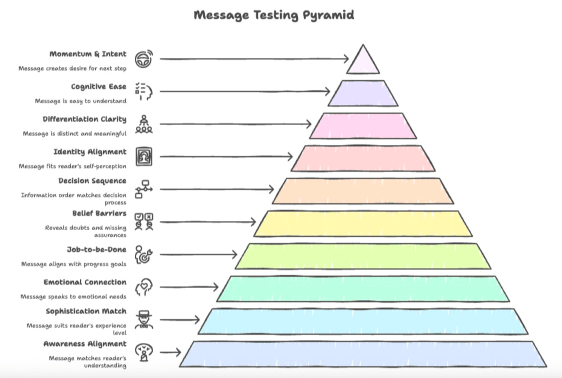 Welcome to Unpacking Meaning. If you received this from a friend and enjoy it, subscribe here. How to systematically test your copy before it goes liveMessage testing has always meant one of two things: expensive user research you couldn’t afford, or shipping and hoping you got it right. You’d write the homepage. Get internal feedback. Maybe show a few friendly customers. Then launch and see what happened. If it worked, great. If it didn’t, you’d rewrite under pressure while conversions bled out. The bottleneck was access and speed. By the time you recruited testers, scheduled sessions, and analyzed feedback, you’d already shipped. Testing happened too late to matter. Enter AI and synthetic researchSynthetic research, or using AI/LLMs to create AI personas that mirror your ICP, is collapsing that timeline. You can simulate your customers now. Build a persona from research, feed it your message, and get feedback in an hour. Iterate fast. Test multiple versions. And catch problems before anything goes live. While it’s not 100% accurate (yet), you can get very good directional feedback cheaper, faster and more repeatably than with traditional research. But efficiency only helps if you know how to take advantage of it. I’ve spent years testing messaging with clients. Sometimes we’d catch a gap in how much people knew about our solution space and in the language we used. Sometimes a we hadn’t considered a specific belif we needed to address before asking them to takew action. Other times we were prioritizing a job to be done over one that mattered more. But the way we’ve identified those gaps was repeatable: people move through the same psychological checkpoints when they internalize a message. So I mapped them, wrote the questions, and tested the sequence on fifty-plus projects. Now synthetic research makes this accessible to every team. You don’t need a research budget or a three-week timeline. You just need the right questions in the right order. That’s the gap I wanted to fill with… The Message Testing PyramidThe pyramid is a structured framework to test messaging psychology across ten stages, or the checkpoints people naturally move through when they “absorb” what they read during a buying process. Keep in mind, you’re not testing your ICP, nor product-market fit. You’re simply testing the message itself: whether it’s clear, relevant, believable, and whether it creates momentum. Each stage comes with specific, non-leading questions you can ask a synthetic persona (or real customers) to surface gaps you wouldn’t catch on your own. The 10 stages:1. Awareness Alignment: Does this match their current understanding, or assume context they don’t have? 2. Sophistication Match: Does this fit their experience level with the category? 3. Emotional Connection: Does this speak to what matters emotionally? 4. Job-to-be-Done Resonance: Does this align with the progress they’re trying to make? 5. Belief Barriers: What doubts show up? What assurances are missing? 6. Decision Sequence Fit: Is information ordered the way they naturally decide? 7. Identity Alignment: Does this fit how they see themselves professionally? 8. Differentiation Clarity: Does this feel distinct, or like every other option? 9. Cognitive Ease & Clarity: Can they understand and repeat it easily? 10. Momentum & Next-Step Intent: Does this create desire to take the next step? How to use itStart with the copy you’re about to ship. Headline, pricing intro, email subject—doesn’t matter. Just dive in with a goal for what you plan on learning from your test. Go to stage 1. Ask any of the questions. The framework includes 5–6 per stage designed to reveal friction without leading to the answer. Run it through a synthetic persona built from your customer research. Or test with real customers if you have quick access. Record the responses, and watch for red flags around confusion, hesitation, misunderstanding etc. Refine the message, move to stage 2. Keep going until you hit stage 10. It’s important you follow the stages, too. People process messages in sequence. First your message needs to be clear and have some kind of emotional impact for them to keep reading. It also needs to be relevant to them, and then they can start digging into the value you offer. Only if they find enough value in your priomise they will take action. By the end, you’ll have data and a clearer idea of why your copy works, and where it might not once you set it live. Three ways to deploy itBefore launch: Test your homepage hero, your pricing page intro, your campaign copy. Catch gaps when changes are still cheap to make. During iteration: You’ve shipped, but something doesn’t work. Use the pyramid to diagnose which stage needs work. For rapid validation: You need to test five headline variations. Run each through stages 1 to 10 to see which one clears the critical checkpoints. Next stepI've just filmed a 20+ min video walkthrough of exactly how I go about validating messaging using synthetic research. Check it out here. And you want the complete framework, all ten stages with the full question sets for each, reply and I’ll send it over. RESONANCE"always to define whatever it is we perceive-to trace its outline-so we can see what it really is: its substance. Stripped bare. As a whole. Unmodified. And to call it by its name-the thing itself and its components, to which it will eventually return. Nothing is so conducive to spiritual growth as this capacity for logical and accurate analysis of everything that happens to us." Marcus Aurelius, Meditations Have a great weekend! Cheers, Chris 🙌🏻 Let’s be friends (unless you’re a stalker) When you're ready, here's a few ways I can helpNot sure where to start? Take our free message-market fit scorecard. |