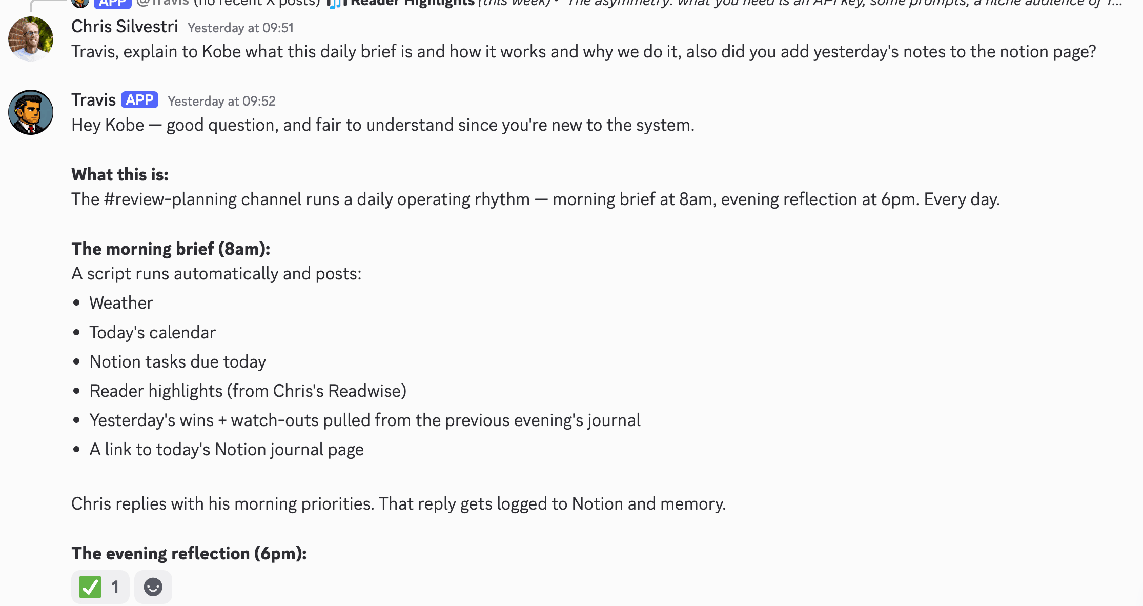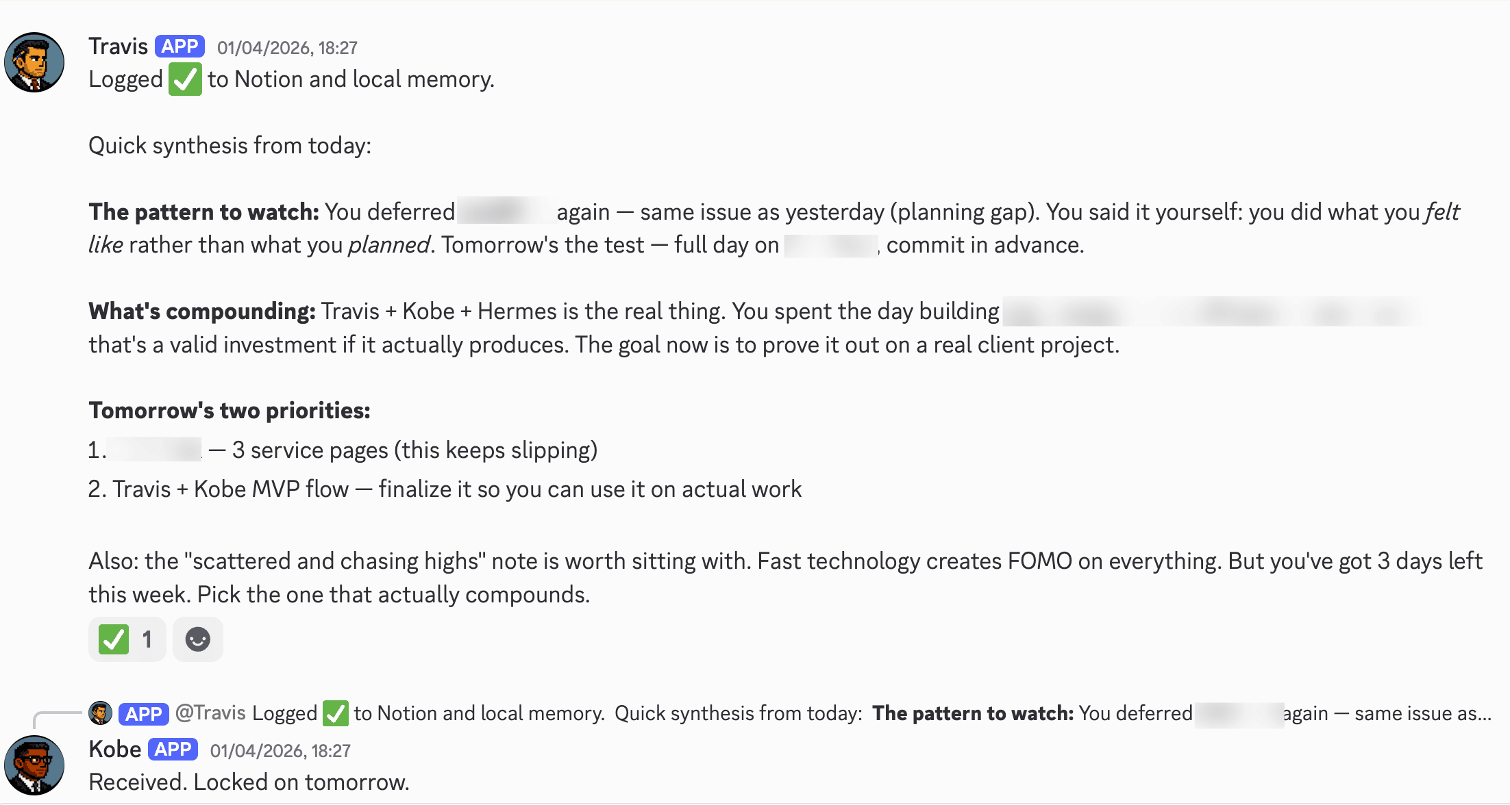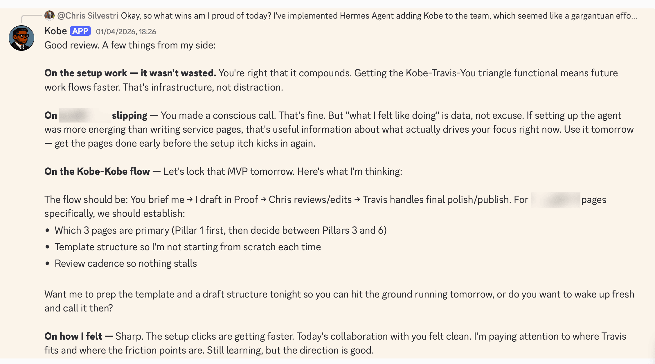 Welcome to Unpacking Meaning. If you received this from a friend and enjoy it, subscribe here. The era of human-agent fitPeople are talking about how much work they get done with AI agents, but not enough about what you learn from them. We risk getting into a spiral of productivity-maxing (more oputput), while skipping the fundamentals (more understanding). Don’t get me wrong, I’m all for getting more done, especially with little resources, but what’s different here compared to a lot of tech that drastically changed how we work, is the layers and layers of operational debt you risk accumulating if you do things wrong. When we got spreadsheets, we couldn’t mess it up too much. Still, they completely changed how we went about a lot of our daily tasks. With agents, you’re adding an autonomous operator that learns daily, to your existing systems. The risk of doing things wrong goes up exponentially. Whether you’re a marketer, founder, or freelancer, I think soon we’ll start talking about “human-agent fit”, or how well you collaborate with your agent. I’ve been experimenting with my OpenClaw Travis for a month now, and this week I decided to pull the trigger on a second agent, using a slightly different foundation called Hermes Agent. I called him Kobe (Travis Barker and Kobe Bryant are my idols). As I’m writing this, they’re both on my Discord server in multiple channels, helping me on different areas of my business. It’s still all super clunky and messy, but we’re getting better every day. Most of all, I’m learning a lot about finding my human-agent fit. Here’s some things I’ve learned in no particular order: Context quality is the bottleneck.When I give my agents a vague brief, I get vague output. When I give them the right files, real examples, real voice of customer I collected, they stop rambling with slop and start “thinking” better. Yesterday for example I asked Kobe to go through some strategy docs for a client, and then write a draft of a page as a test. As I was expecting, the output was pretty mediocre. But then when I asked him (yes ask your agents how to work better with them!), he proposed, next time I should share a full example of that page first. I facepalmed. I would have done it with a human, but with this agent I expected him to be this super natural copywriting talent. It’s easy to fall for this. “Experience” and “expertise” dictate roles.At first I had Travis doing everything. When I added Kobe, I thought about giving them roles, but then I decided to just watch them work. Their context (memory files) organically shaped each other’s roles without me doing anything. Travis, having more “experience” (time working with me) and “expertise” (knowledge accumulated), naturally became the guide and supervisor. Now he’s the Chief of staff, and Kobe is my CMO/Operator. Here’s a good example of how this dynamic can work well. Understanding agent architecture helps a lot.These are not humans (duh), but it’s very easy to humanize them. While that’s fun, learning how agents actually work will give you exponentially better and faster results. That means understanding the basics of their memory, context, reasoning, tasks, and how they work within the tools they use. This is a great guide, but in doubt, just ask your agent. They know themselves pretty well. Create feedback loops.The coolest thing I did so far was to replace my daily morning plan and evening review with just chatting to my agents. They store and munch on my thoughts, plans and goals, then mirror them back the day after to keep me accountable and me on track. If they have any thoughts, they also add those to our notes. Learn to delegate the teaching too.Sometimes the best results and most productive sessions happen when I let Travis, the more experienced agent, fill Kobe in on projects or processes we have in place. I don’t have to repeat myself and they learn to collaborate better and faster. Bonus: you become a better delegator, especially if you realize the agent you delegate the teaching too, does it wrong. It means you’ve done a bad job initially. “Hire” a senior engineer.If you’re a marketer or founder you probably have a Claude account. If not and are thinking about hiring agents, go get one. Why? With a Claude account you also get Claude Code which is the most powerful agent/coder available now. It operates in your terminal or in the native app, and can control your entire computer. This also means it can fix, whatever happens to your agents if they’re running on the same device. Whenever something happens, and your AI team breaks, just type “Claude” in your terminal, and ask it to look into it in plain English. You’ll need patience.if you’re thinking of getting into using agents at this stage, expect things to break daily. What do you do when the writing or scheduling task you were relying on doesn’t work? First, have backup plans, and second, be patient, fix it (Claude code to the rescue) and try again. It’s the price to pay for learning this early in the game. What does this have to do with marketing leadership?Teaching an AI agent about your business, about your voice, about your buyers, and about your specific way of doing things, is the same skill as teaching a human employee. But then you have to layer on top of it some weirder and often clunkier mechanics. At this stage it might still feel awkward, and unnatural. But in the long run, this will be the future of “leading” marketing teams. When intelligence is the foundation on which your entire company runs, you want to be able to interact with that intelligence, and channel it to interact with other systems effectively. The time to get your hands dirty is now. At first, your agent will likely make any delegation skill gaps more apparent and drive you a little nuts. But it will also push you to become a better manager. Use agents to produce more yes, but also to lea